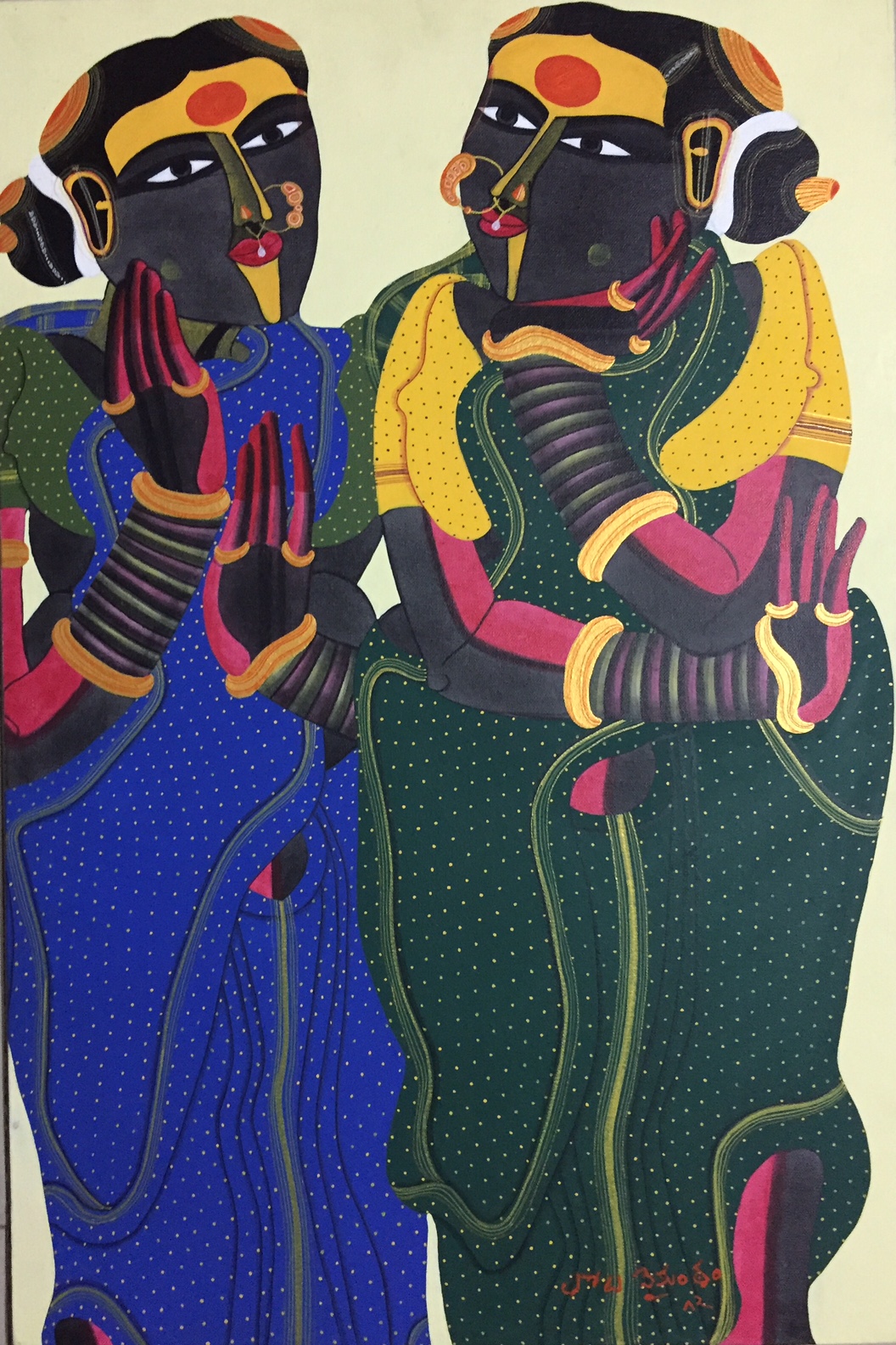 Thota Vaikuntam in his art draws his inspiration from the rural environs of Telangana and the men and women who inhabit that space. Born in 1942 in Boorugupali, Telangana, Vaikuntam currently is based in Hyderabad. Vaikuntam completed a Diploma in Painting at the College of Fine Arts and Architecture, Hyderabad and then another in Painting and Printmaking from the Faculty of Fine Arts at Maharaja Sayajirao University, Baroda under the tutelage of KG Subramanian. His art tries to capture the vibrancy of life in his natal village through a detailed exploration of the men and women in the region. He is particularly fascinated by the sensuousness of the feminine form and traces this fascination back to his childhood experience watching travelling theatre groups in his village which had male impersonations of female characters. At first deeply skeptical of the sensuousness of his art which was very Indian in essence, Vaikuntam came into his own with a complete acceptance of this central aspect of his works.