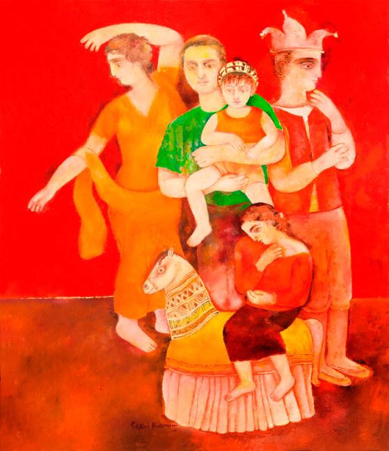 Born in Kolkata in 1935, Sakti Burman studied at the Government College of Arts and Crafts, Kolkata, and later at the École Nationale des Beaux Arts in Paris. Burman uses pointillism and a marbling technique achieved by blending oils with acrylics to create fresco-like works on paper and canvas. Burman’s paintings often evoke a surrealist feel, referencing multiplicities of time and place. His art drew extensively from Hindu and European mythology, as well as from the artist’s own memories. Suggesting surrealism, his paintings are populated by humans, animals and cityscapes that are dreamlike in appearance. His defining oeuvre owes largely to his technique of marbling, which he arrived at after years of experimentation. Burman travelled to Italy in 1958 and his encounter with the frescoes of Giotto, Piero de la Francesca and Simone Martini inspired him to assimilate their monumentality and textures in his works.
