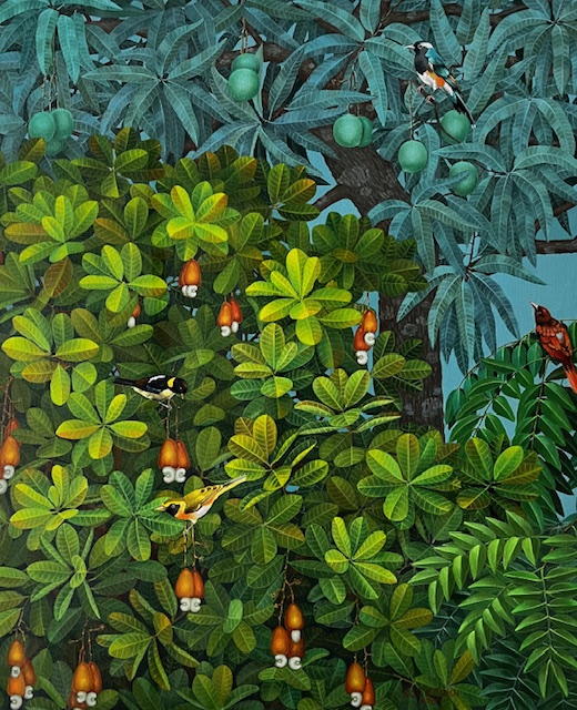Roy K John (1977) reminds his viewers of the avant-garde art movement in France that came into prominence during the post-impressionist's era. Newer styles were being applied to newer ways of looking at the world beyond the borders of the country, when artists, like Henri Rousseau, made big contributions to the art world. John's art elaborates on his own identity as a resident of the tropical parts of the world and politically claim the flora, faunas, fruits, and the animals that are