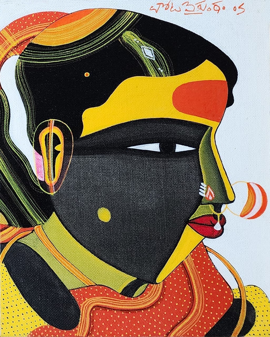 Hence his art is dedicated to deeper reflections on the Telangana region, the rhythms of a rural existence and especially the women’s vibrant existence. The Telangana women are the central figures in his art; he details their contour, their hues, the decorative motifs on their dress, their caste marks and hasta mudras, and their exquisite jewellery in his paintings. An instinctive artist, Vaikuntam highlights the flair and spontaneity of the women and the distinct demeanor of the elaborately dressed men of the region. The large red bindis set on turmeric-sandalwood foreheads, ornate nosepins and colourful Sircilla saris offset against the dark skin of the women have become signature motifs in Vaikuntam’s paintings and have become very famous within the Indian contemporary art circles.