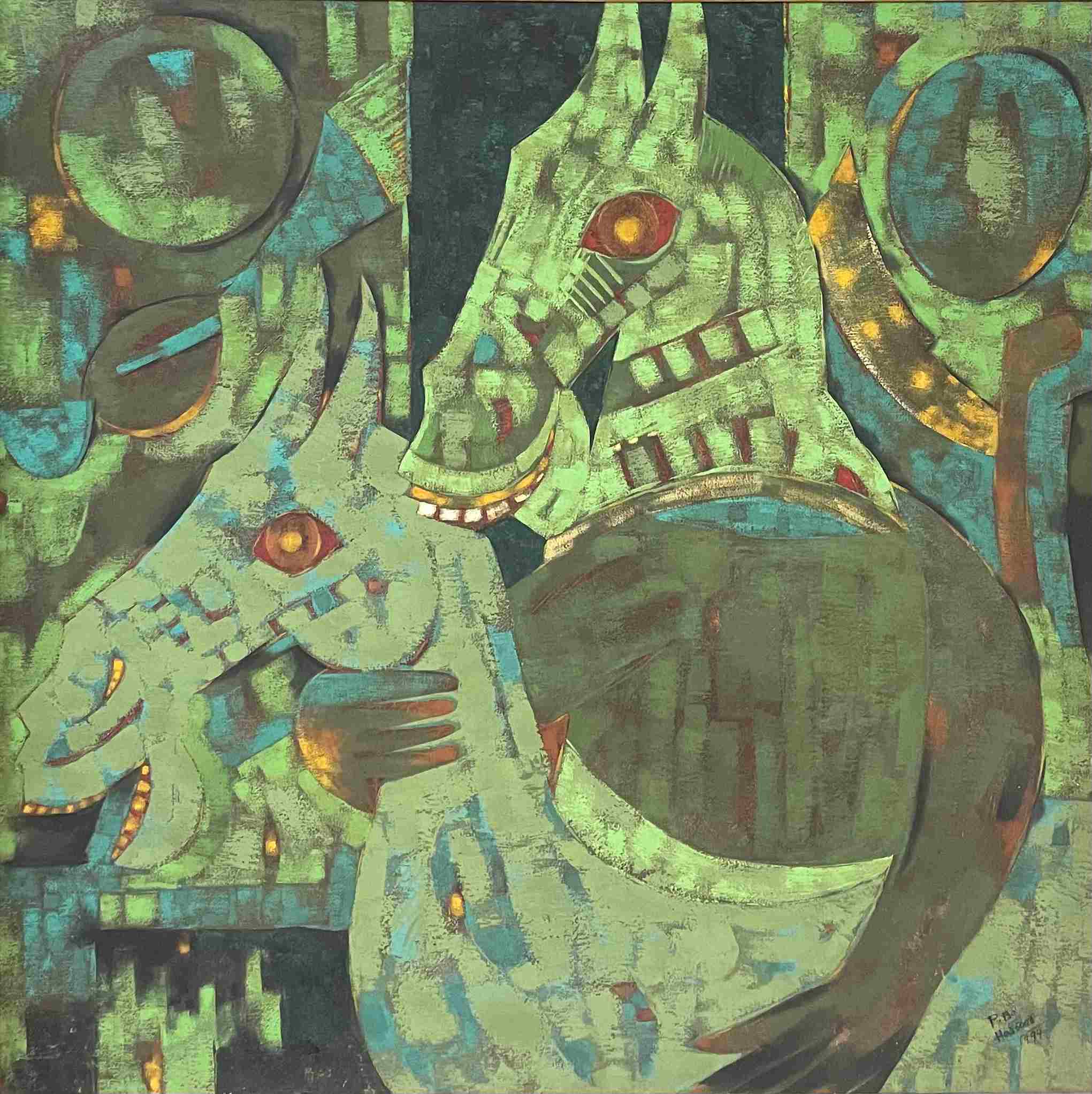 Prabhu Harsoor (1962) has been reflecting on forms that transpire between the abstract and the figurative and acquire a visual language that is particularly his own. He has several visualisations from his memories that have given his works a special treatment in the realm of the distorted from that of the concrete. Some of his abstractions are similar to a linguistic script and are deliberately engaging with the idea of the formation of a language. Very evocative of the famous Indian modernist Artist Vasudeo S. Gaitonde's works, Harsoor explores alphabets as he visualises them and, in the process, engages with the idea of the artistic practice of script-making and the lingering unfamiliarity that is staged at the earliest stages of creation. He stretches his imagination from cultural images of communities in India, especially that of Karnataka, to that of the past and the present, where he visually extends his feelings of the immediate moment in his experience. His abstractions are remotely representational as he dabbles at creating a newer visual culture and impact through the existing idea of the script. He also extends his visual currency towards the narration of political thoughts and leaders who have contributed immensely to the building of Karnataka's voice against fundamentalism.
