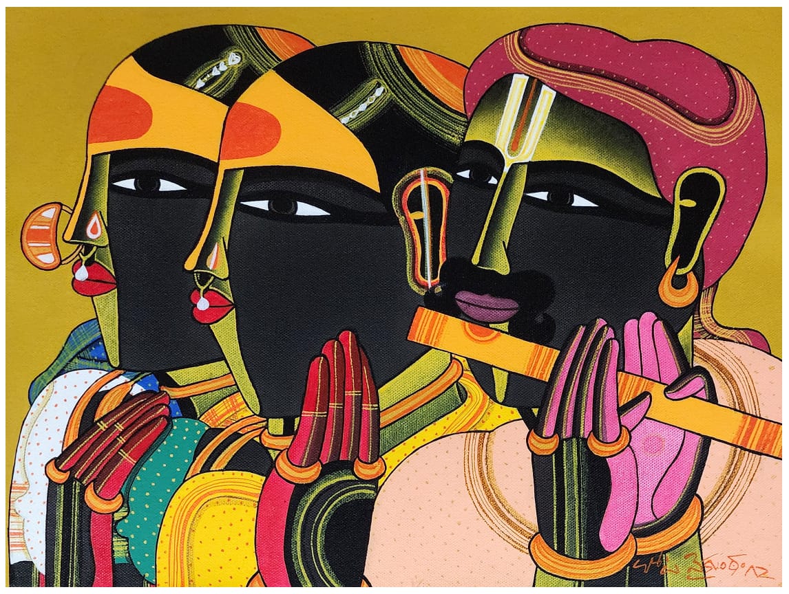 Thota Vaikuntam in his art draws his inspiration from the rural environs of Telangana and the men and women who inhabit that space. Born in 1942 in Boorugupali, Telangana, Vaikuntam currently is based in Hyderabad. Vaikuntam completed a Diploma in Painting at the College of Fine Arts and Architecture, Hyderabad and then another in Painting and Printmaking from the Faculty of Fine Arts at Maharaja Sayajirao University, Baroda under the tutelage of KG Subramanian. His art tries to capture the vibrancy of life in his natal village through a detailed exploration of the men and women in the region. He is particularly fascinated by the sensuousness of the feminine form and traces this fascination back to his childhood experience watching travelling theatre groups in his village which had male impersonations of female characters. At first deeply skeptical of the sensuousness of his art which was very Indian in essence, Vaikuntam came into his own with a complete acceptance of this central aspect of his works.