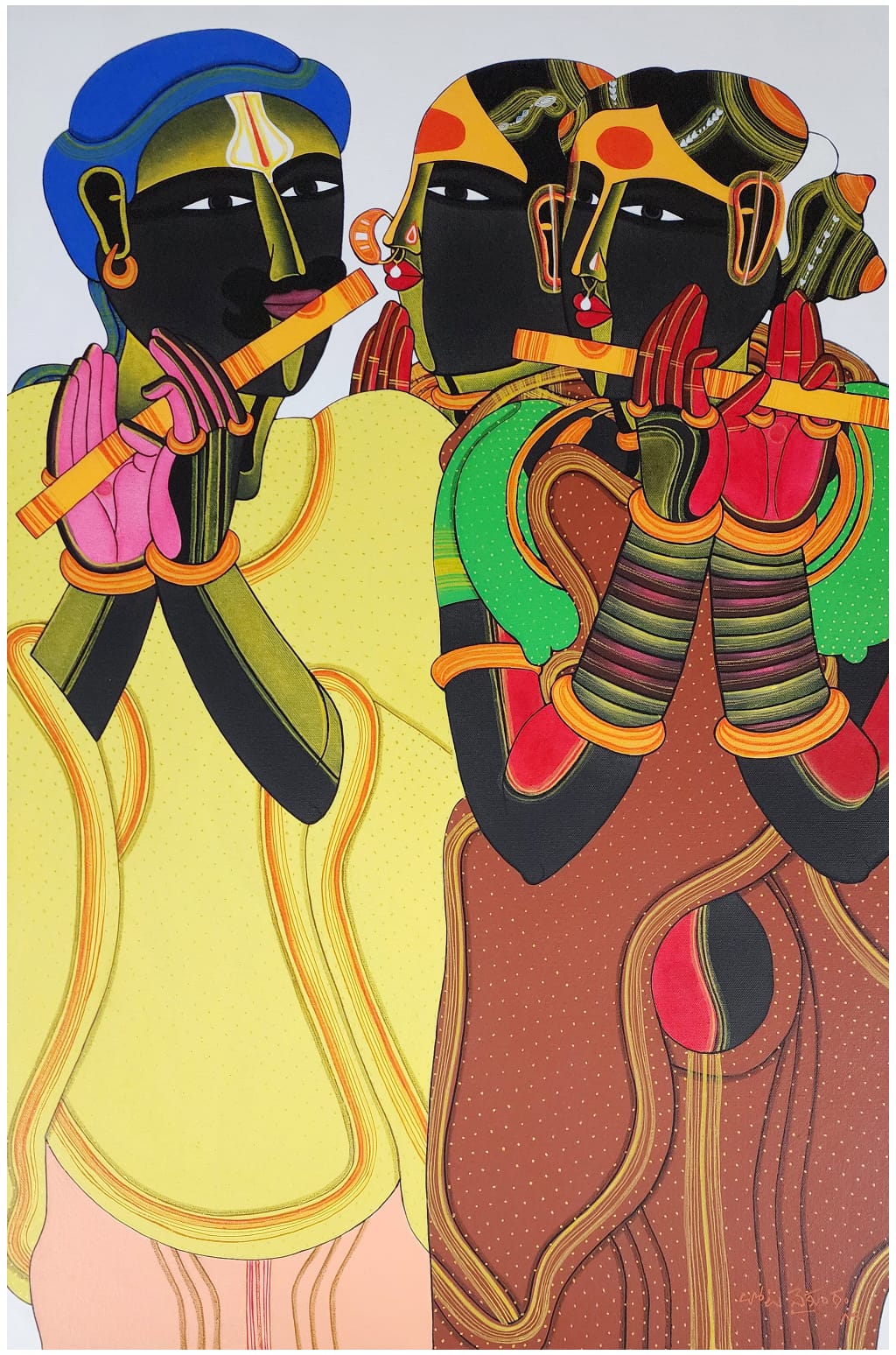 Thota Vaikuntam in his art draws his inspiration from the rural environs of Telangana and the men and women who inhabit that space. Born in 1942 in Boorugupali, Telangana, Vaikuntam currently is based in Hyderabad. Vaikuntam completed a Diploma in Painting at the College of Fine Arts and Architecture, Hyderabad and then another in Painting and Printmaking from the Faculty of Fine Arts at Maharaja Sayajirao University, Baroda under the tutelage of KG Subramanian. His art tries to capture the vibrancy of life in his natal village through a detailed exploration of the men and women in the region. He is particularly fascinated by the sensuousness of the feminine form and traces this fascination back to his childhood experience watching travelling theatre groups in his village which had male impersonations of female characters. At first deeply skeptical of the sensuousness of his art which was very Indian in essence, Vaikuntam came into his own with a complete acceptance of this central aspect of his works.