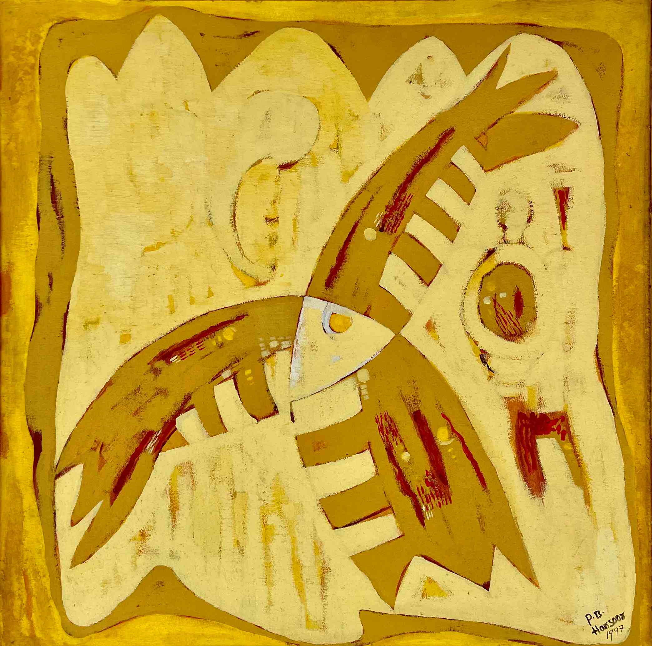 Prabhu Harsoor (1962) has been reflecting on forms that transpire between the abstract and the figurative and acquire a visual language that is particularly his own. He has several visualisations from his memories that have given his works a special treatment in the realm of the distorted from that of the concrete. Some of his abstractions are similar to a linguistic script and are deliberately engaging with the idea of the formation of a language. Very evocative of the famous Indian modernist Artist Vasudeo S. Gaitonde's works, Harsoor explores alphabets as he visualises them and, in the process, engages with the idea of the artistic practice of script-making and the lingering unfamiliarity that is staged at the earliest stages of creation. He stretches his imagination from cultural images of communities in India, especially that of Karnataka, to that of the past and the present, where he visually extends his feelings of the immediate moment in his experience. His abstractions are remotely representational as he dabbles at creating a newer visual culture and impact through the existing idea of the script. He also extends his visual currency towards the narration of political thoughts and leaders who have contributed immensely to the building of Karnataka's voice against fundamentalism.