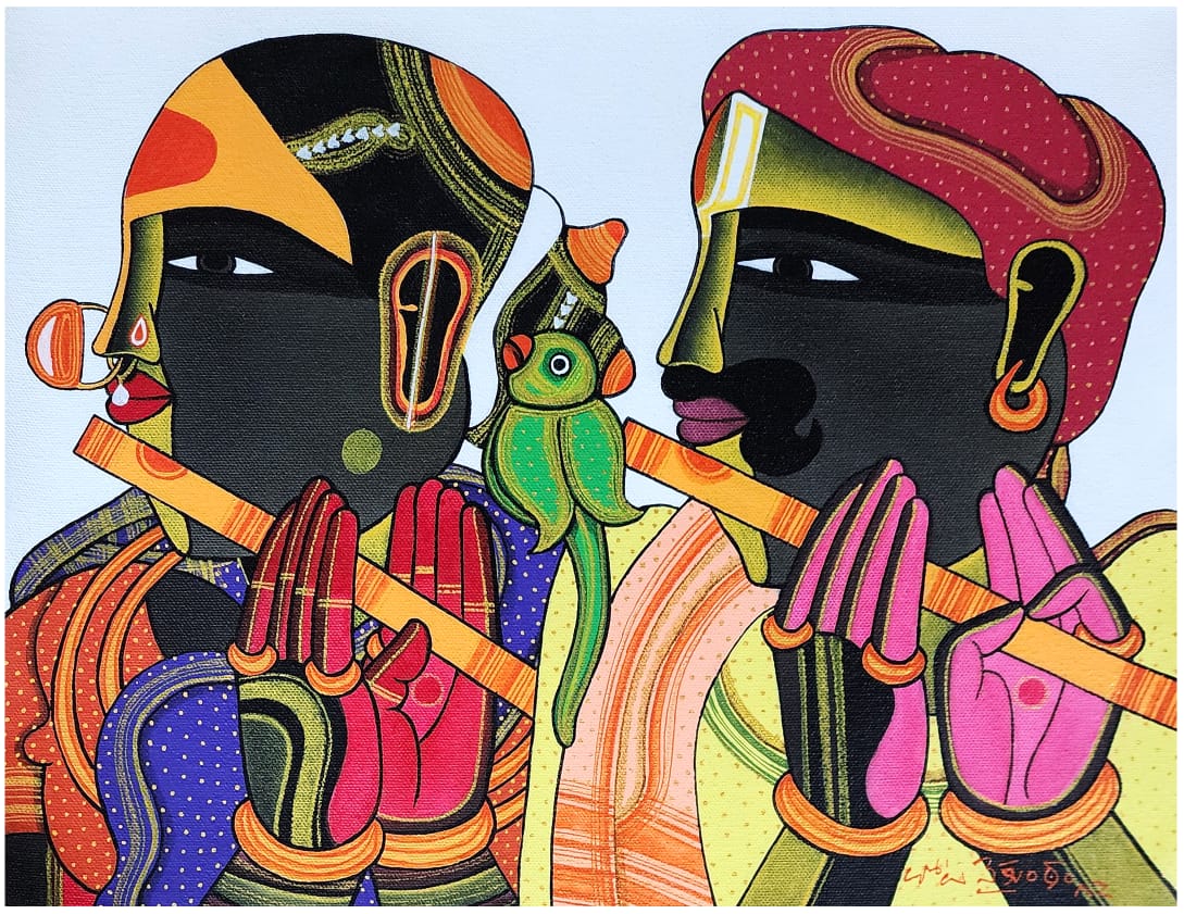 Vaikuntam prefers an exclusive use of primary colours, as these are natural colours found around us, while composite colours do not exist naturally. He believes in using bright rich primary colours especially red, orange and saffron, which he terms as Indian colours,to give depth and character to his central figures. The women and men in his paintings look larger than life, filling his small frames. He uses small patterns to illustrate the garments and ornaments setting his central motifs in vivid pigments. His placement of form without illusionistic depth and the repetition of central figures are reminiscent of the folk paintings, yet his restructuring of the form is very contemporary in ethos.