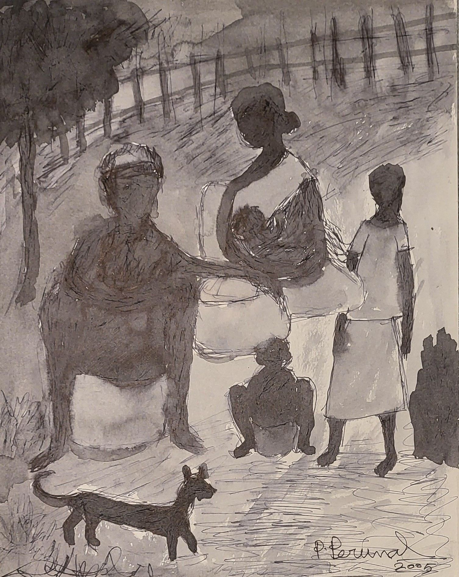 P. Perumal (b. 1935, Tamil Nadu) was a National Scholar in drawing and painting (1962–64). Deeply influenced by his rural childhood, he went on to study at the Government College of Arts and Crafts, Chennai, where he became a member of the Progressive Painters’ Association founded by K. C. S. Paniker. Dedicated to reviving traditional artistic approaches, he developed a distinctive visual language marked by expressive line work and graceful, elongated figures.
