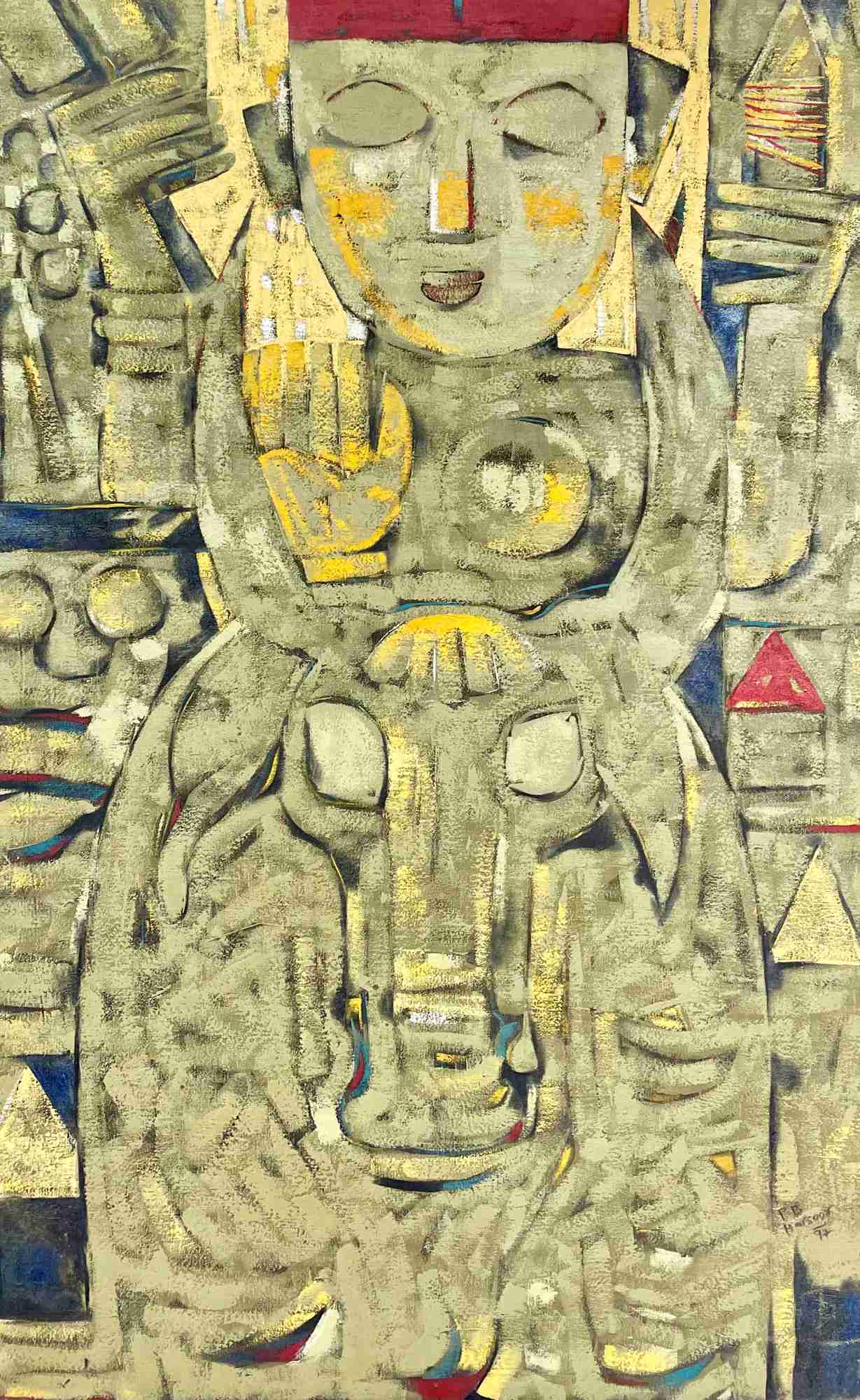Prabhu Harsoor (1962) has been reflecting on forms that transpire between the abstract and the figurative and acquire a visual language that is particularly his own. He has several visualisations from his memories that have given his works a special treatment in the realm of the distorted from that of the concrete. Some of his abstractions are similar to a linguistic script and are deliberately engaging with the idea of the formation of a language. Very evocative of the famous Indian modernist