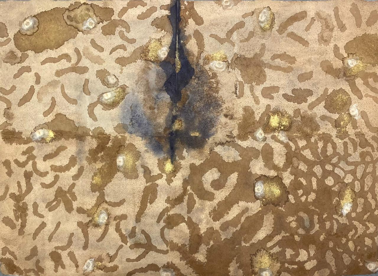 Rice paper, coffee, fevicol, water colour, acrylic gold, oroxylum indicum seeds on acid-free handmade paper