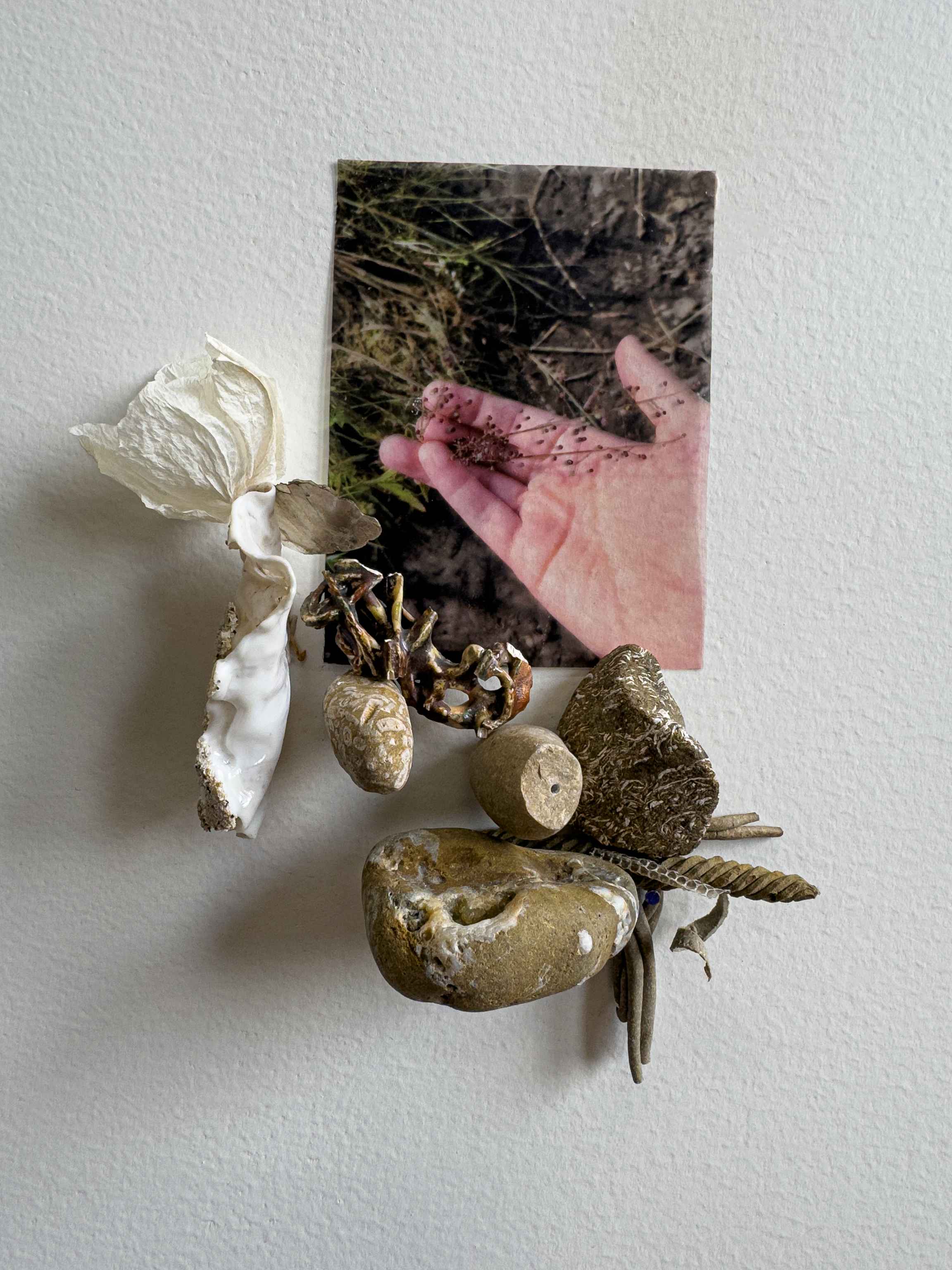 From the series Glyphs of a Temporal Landscape, dried phalaenopsis orchid, porcelain, mica (Noresund, NO), fossil rocks, geode (Steuben, USA), Common wolf snake skin | 10 x 6 inches