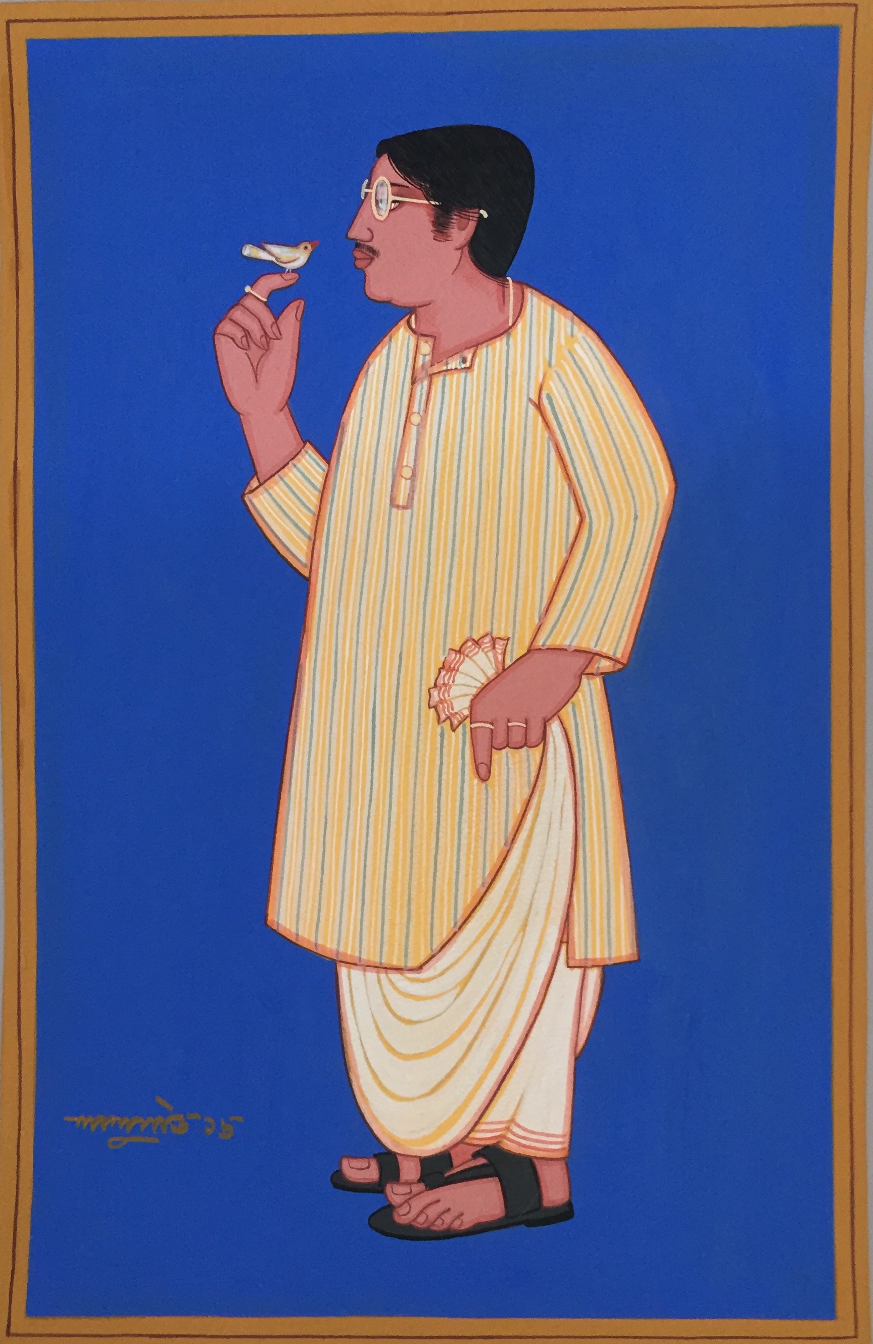 Shaw is known to have deftly captured the middleclass life of Bengali men and women, the bhadralok. Mainly working in tempera and gouache, with adept economy of lines, he painted the lives of babus and bibis in portraits that brim with an element of hidden drama. These works reveals Shaw’s fascination with the pre-independence Company School of art, the traditional Kalighat Patachitras, and the Ajanta cave paintings. Shaw has professed his admiration for the artist Jamini Roy and was inspired by Roy’s borrowings from Kalighat paintings. Shaw’s highly stylized paintings reflect his interest in patterns, where each minute detail is called in for its significance, reminding one of the miniature portraits of the past. It is while working at the Kala Bhavan, at the photography studio in Santiniketan, that he had observed closely the Bengali babus who come in dressed in dhotis, and the ladies decked up in their best saris pose with flowers or a mirror. They soon became his muse, and he is best known for his images of babus and bibis, depicted in tempera. The local attires which includes the unique way Bengali’s tie their saris and dhotis, the ubiquitous umbrella in the hands of men on the road, the distinctive hairstyles and adornments, even the plantains in the background, all make Shaw’s depiction of the middle class life, a very intimate portrayal. It is no wonder that Shaw’s early works in this realm, like ‘Asha Lata’ which captures locals during Shantiniketan’s winter fair, are still admired.