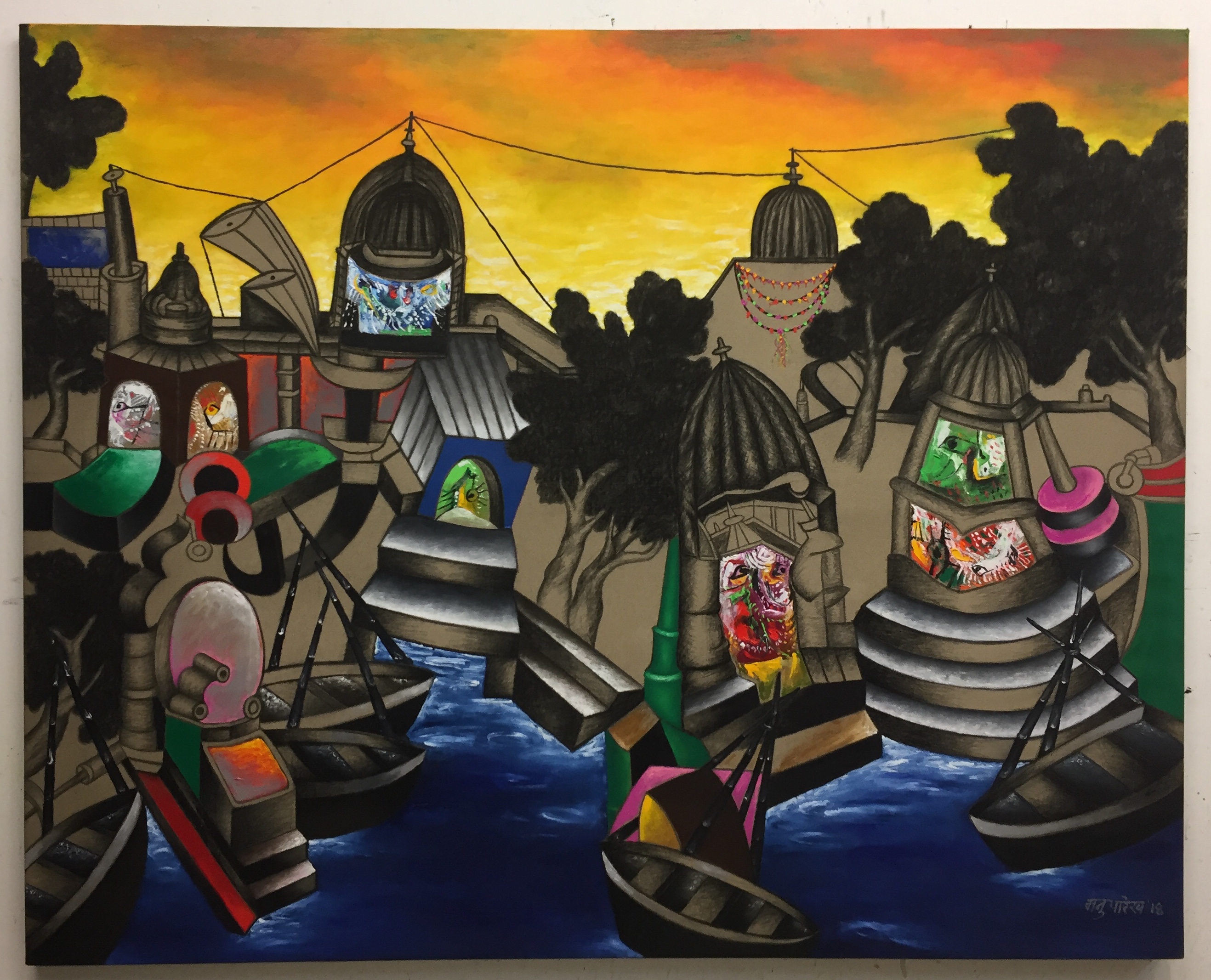 Banaras as a city came to play an integral role in Parekh’s work after his first visit there following his father’s death. This holy city of hope, of faith, of tourists offered him a vast number of contradictions in one location. Parekh also highlights his relationship with his wife Madhvi, who is a self taught artist, and his admiration for Picasso as key influences on his works.