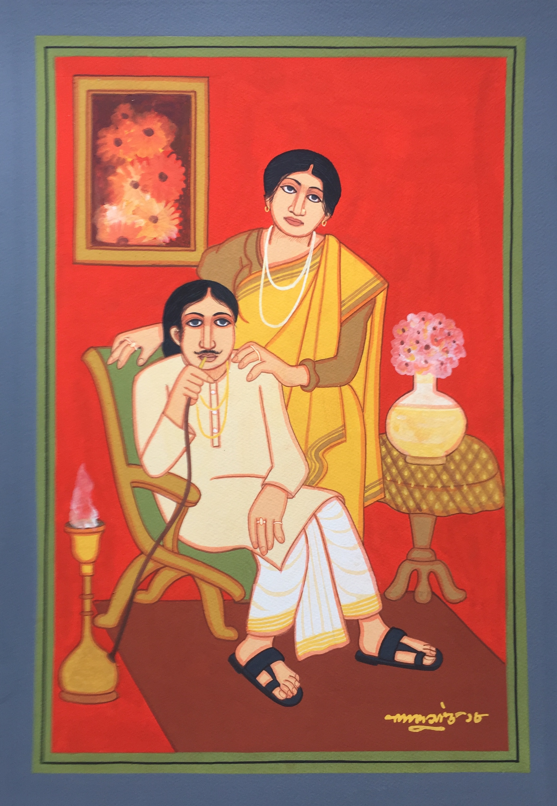Shaw is known to have deftly captured the middleclass life of Bengali men and women, the bhadralok. Mainly working in tempera and gouache, with adept economy of lines, he painted the lives of babus and bibis in portraits that brim with an element of hidden drama. These works reveals Shaw’s fascination with the pre-independence Company School of art, the traditional Kalighat Patachitras, and the Ajanta cave paintings. Shaw has professed his admiration for the artist Jamini Roy and was inspired by Roy’s borrowings from Kalighat paintings. Shaw’s highly stylized paintings reflect his interest in patterns, where each minute detail is called in for its significance, reminding one of the miniature portraits of the past. It is while working at the Kala Bhavan, at the photography studio in Santiniketan, that he had observed closely the Bengali babus who come in dressed in dhotis, and the ladies decked up in their best saris pose with flowers or a mirror. They soon became his muse, and he is best known for his images of babus and bibis, depicted in tempera. The local attires which includes the unique way Bengali’s tie their saris and dhotis, the ubiquitous umbrella in the hands of men on the road, the distinctive hairstyles and adornments, even the plantains in the background, all make Shaw’s depiction of the middle class life, a very intimate portrayal. It is no wonder that Shaw’s early works in this realm, like ‘Asha Lata’ which captures locals during Shantiniketan’s winter fair, are still admired.
