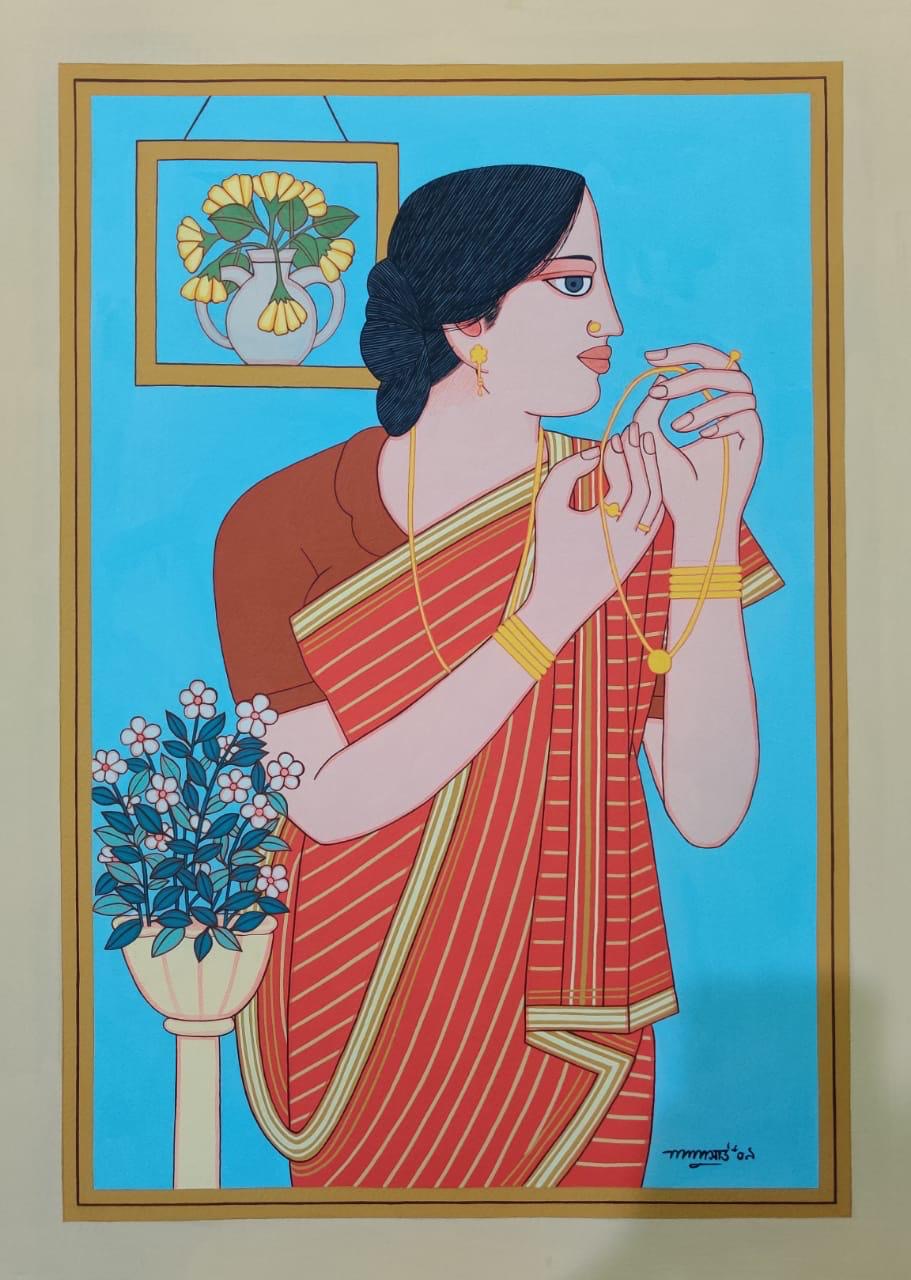 Shaw is known to have deftly captured the middleclass life of Bengali men and women, the bhadralok. Mainly working in tempera and gouache, with adept economy of lines, he painted the lives of babus and bibis in portraits that brim with an element of hidden drama. These works reveals Shaw’s fascination with the pre-independence Company School of art, the traditional Kalighat Patachitras, and the Ajanta cave paintings. Shaw has professed his admiration for the artist Jamini Roy and was inspired by Roy’s borrowings from Kalighat paintings. Shaw’s highly stylized paintings reflect his interest in patterns, where each minute detail is called in for its significance, reminding one of the miniature portraits of the past. It is while working at the Kala Bhavan, at the photography studio in Santiniketan, that he had observed closely the Bengali babus who come in dressed in dhotis, and the ladies decked up in their best saris pose with flowers or a mirror. They soon became his muse, and he is best known for his images of babus and bibis, depicted in tempera. The local attires which includes the unique way Bengali’s tie their saris and dhotis, the ubiquitous umbrella in the hands of men on the road, the distinctive hairstyles and adornments, even the plantains in the background, all make Shaw’s depiction of the middle class life, a very intimate portrayal. It is no wonder that Shaw’s early works in this realm, like ‘Asha Lata’ which captures locals during Shantiniketan’s winter fair, are still admired.