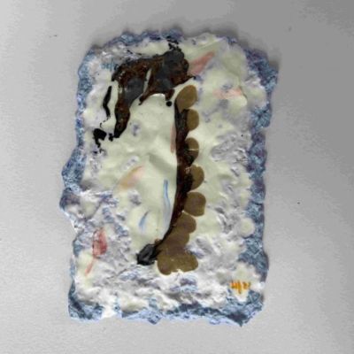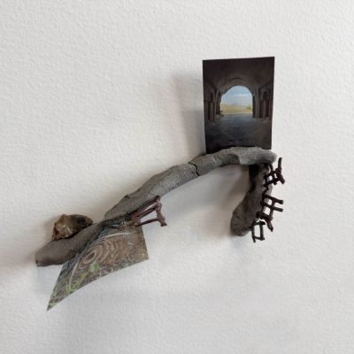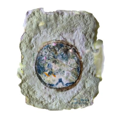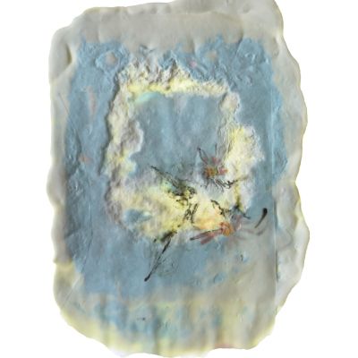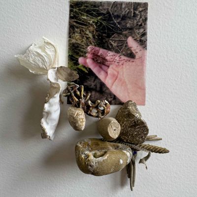 From the series Glyphs of a Temporal Landscape, clay, inkjet print on transparency, lake tumbled stones, porcelain, fossilised leaves, orchid leaf, dried flowers